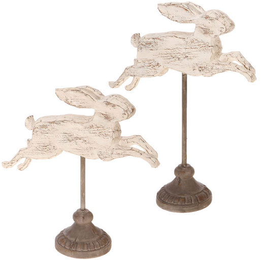 Wood crafted bunny on a stem with a solid, weighted base! Complement your end table or foyer table with this beautiful distressed bunny. Easily breaks down into 3 pieces for easy storage!