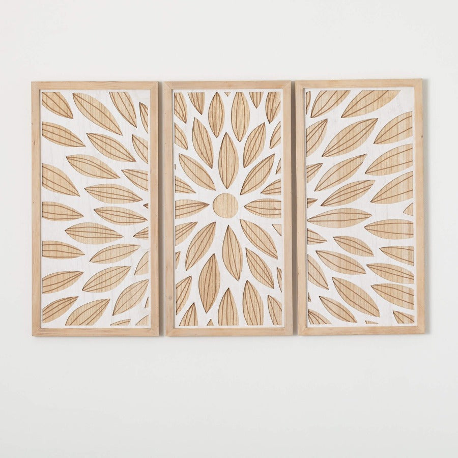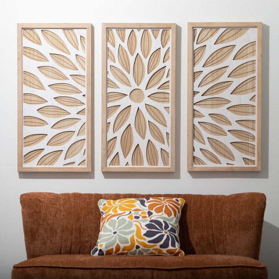 The stunning design of this three piece paneled wall decor is sure to attract attention in any room. Exquisitely crafted, this piece is carefully decorated with a laser cut floral pattern & botanical design, making it the perfect addition to any room in your house.