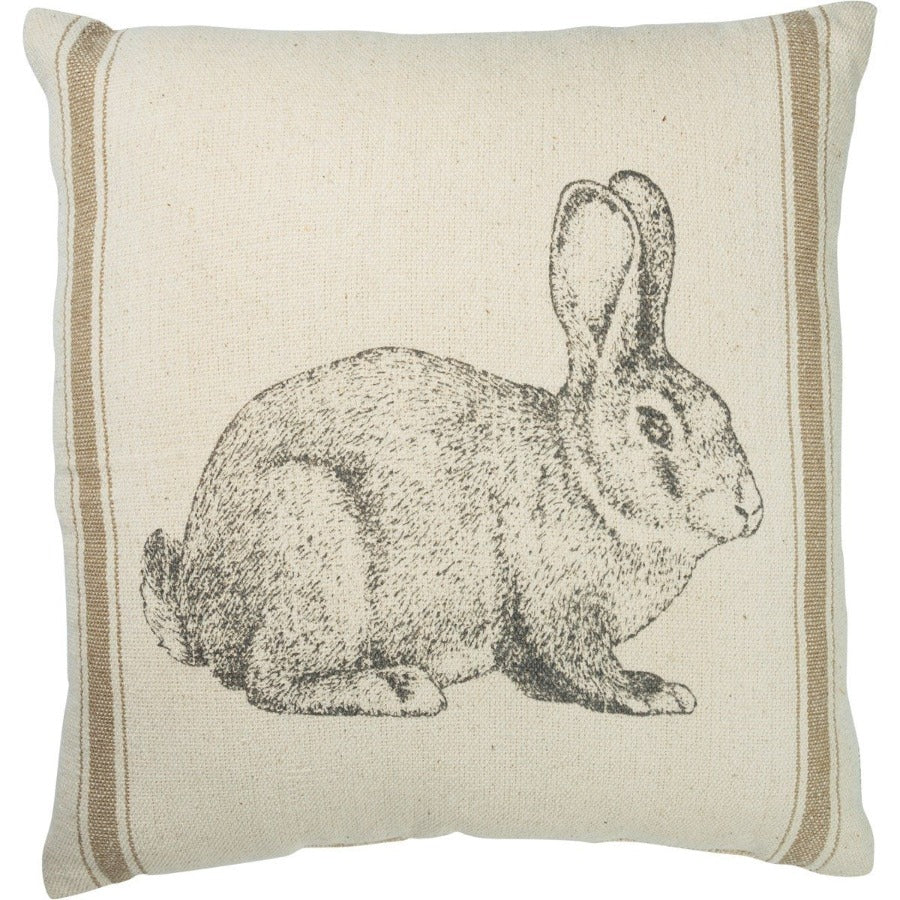 A cotton and polyester pillow featuring a distressed bunny design with striped trim accents in a neutral palette. This Bunny pillow complements well with coordinating pieces in collection for a charming spring display. Shipped vacuum sealed for protection and storage.