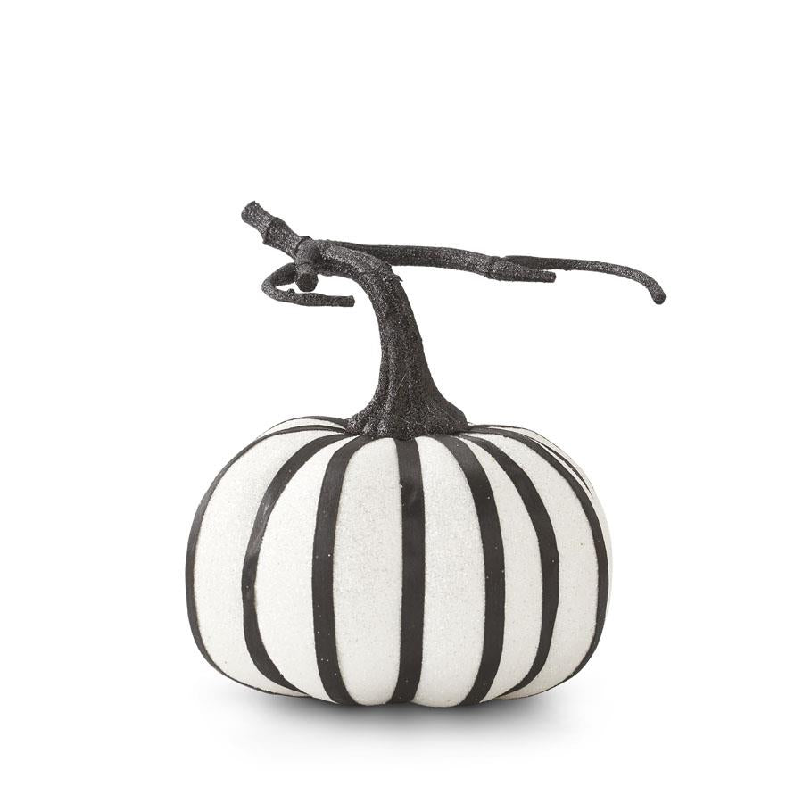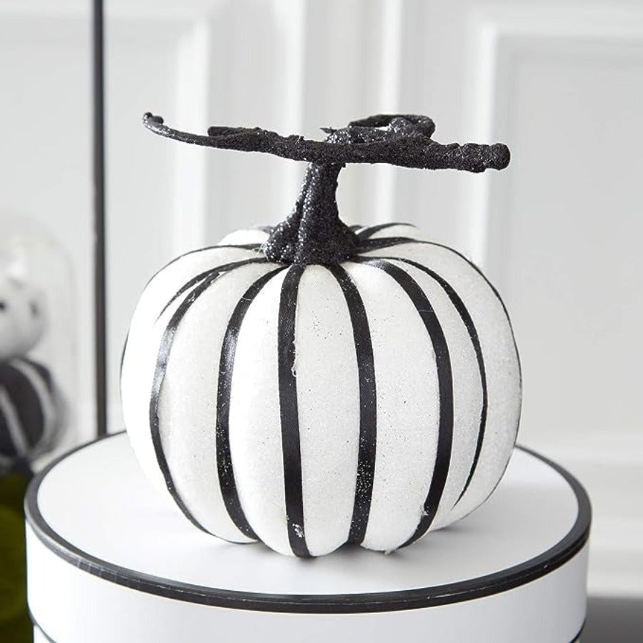 Stay in your black and white theme or add a unique color twist on the traditional black and orange season! This black and white Styrofoam, glittery pumpkin is a perfect accent piece to any shelf or table!